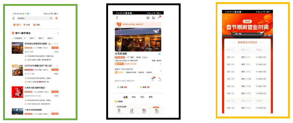 春節営業のレストランは携帯アプリの「大众点评」で検索できます。