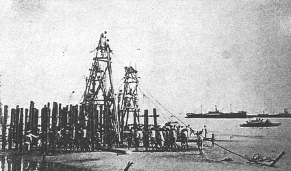 重桟橋のための基礎の杭打ちを示すもので、工兵達が打撃ハン