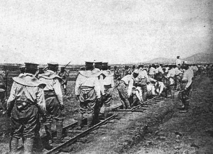 この写真では日本鉄道隊がレール敷設作業に従事しているが、
