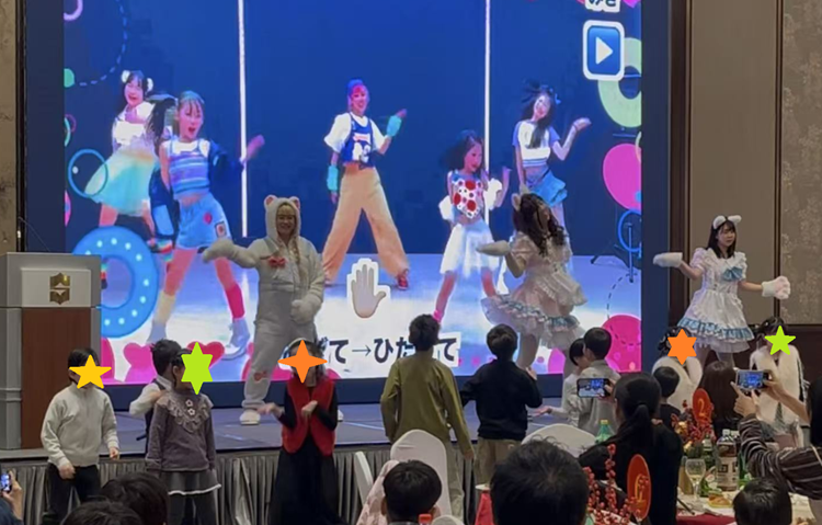 だけじゃだめですか?」でしたが、小学部低学年の生徒さんたちも一緒に踊ってくださり、大きな盛り上がりを見せました。次は、小中高校生たちの「DUMB DUMB/like JENNIE/JUMP」メドレーでしたが、みなさん本格的なダンスを披露してくれました。どちらも違う味わいで、クリスマス会らしい華やかなステージとなりました。
