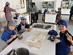 「水餃子作り」では、皮からはみ出さないように一生懸命餡を包んでいました。個性的な形の餃子が勢ぞろいしました。作った餃子は温かいうちに食べ、みんなで食べるおいしさを味わっていました。