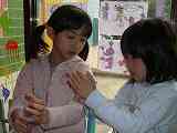あやとりの指導中、小さい子との関わりの中で、思いやりの心も育ちます。