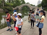 乾隆帝が本を読む邪魔にならないように、カエルが鳴かなくなったといわれる大明湖を見学しています。ガイドさんの話を熱心に聞き、メモを取ったり写真を撮ったりして学習しています。 |