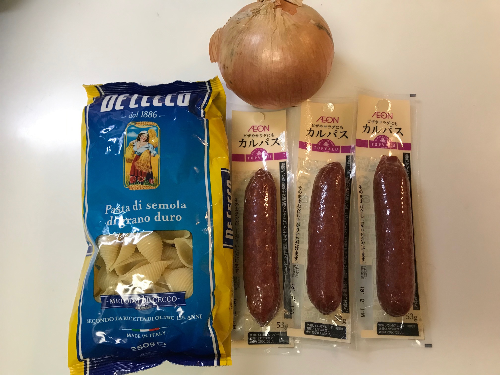 【材料】3人分 カルパス150g、玉ネギ小1個、パスタ適量、オリーブ油大匙3杯、塩・胡椒・オレガノ少々。