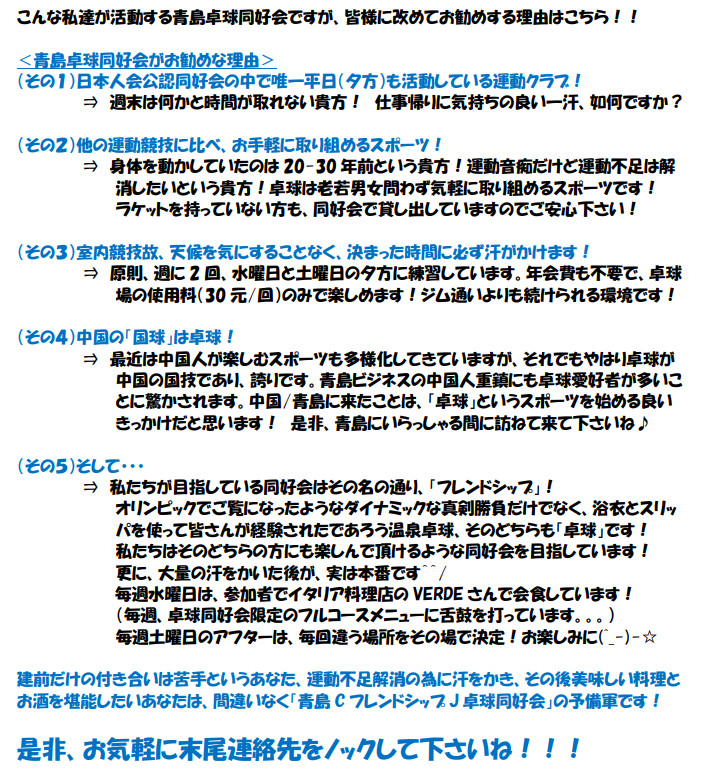 皆さん、こんにちは! 青島卓球同好会 広報部長の 牟禮(Mure)です。