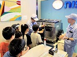 続いてフリーザーを製造している工場に行き、板金の工程を見たり、実際にレーザーで刻印する体験をしたりしました。質問タイムの後は、塩キャラメル味・キャラメルプリン味の2種類のソフトクリームを試食させていただきました。みんな満面の笑顔でソフトクリームを頬張っていました。